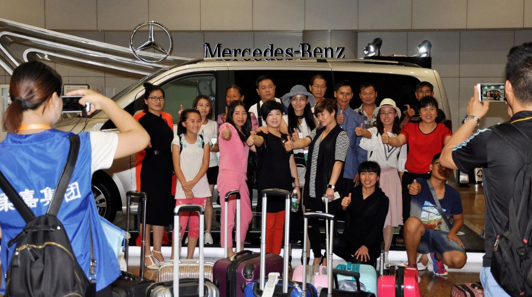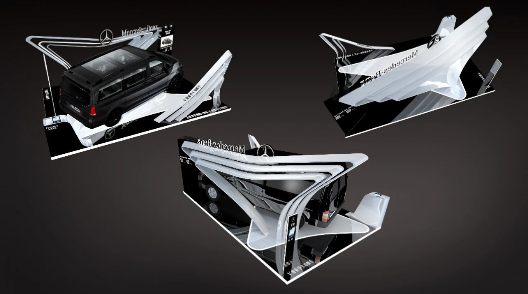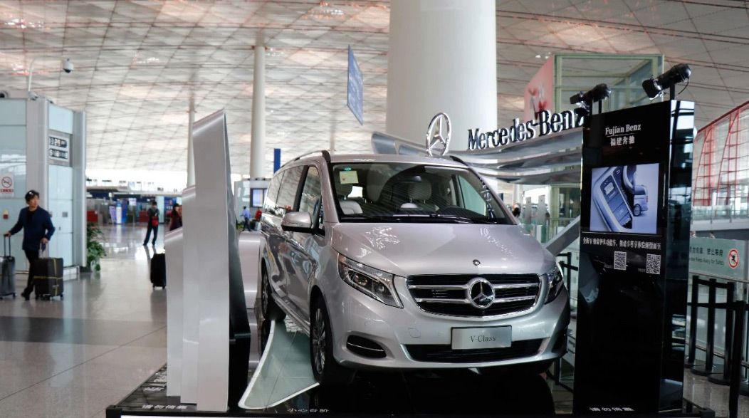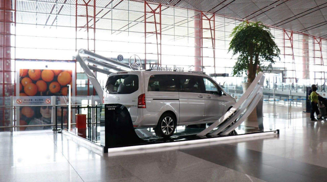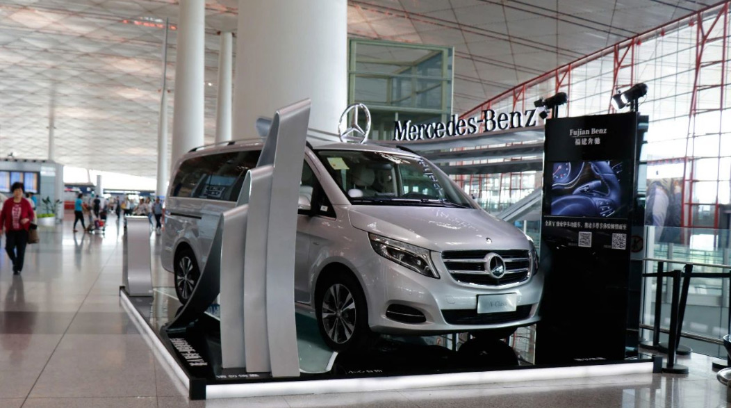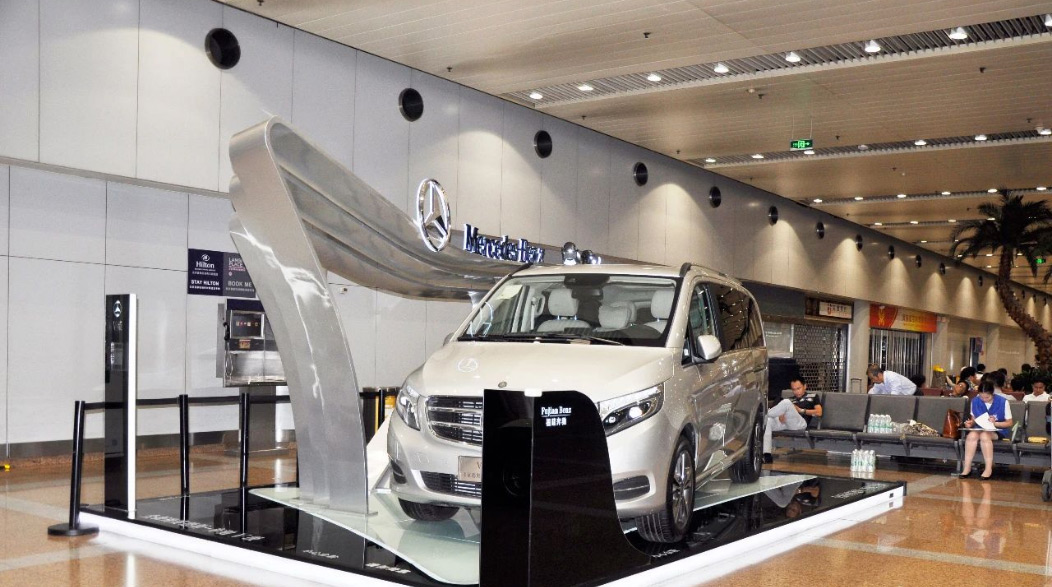 由于張揚向上(shàng)的(de)造型配上(shànΩπ♥Ωg)V-CLASS的(de)尊貴車(chē)型,使得(de)展位一(yī)度成為(★≠wèi)機(jī)場(chǎng)最吸引人(rén)的(de)地(d₹σì)标。随後又(yòu)在T2航站(zhàn)樓到(dào)達展位進行(xín♠ ¶g)二次展示。